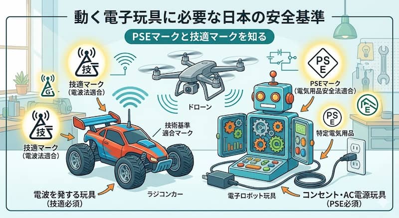 - ラジコンやコンセント付き玩具は「技適」や「PSE」などの法規制に注意する。